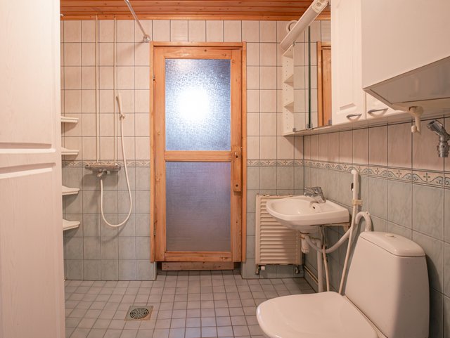 - WC-istuin, suihku, pesukoneliitäntä, peilikaappi, pesuallas, ja bidee-suihku