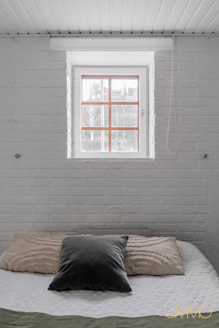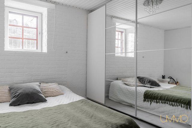 - Korkea liukuovellinen vaatekaappi ja syvät kiintohyllyt. Rullaverho.