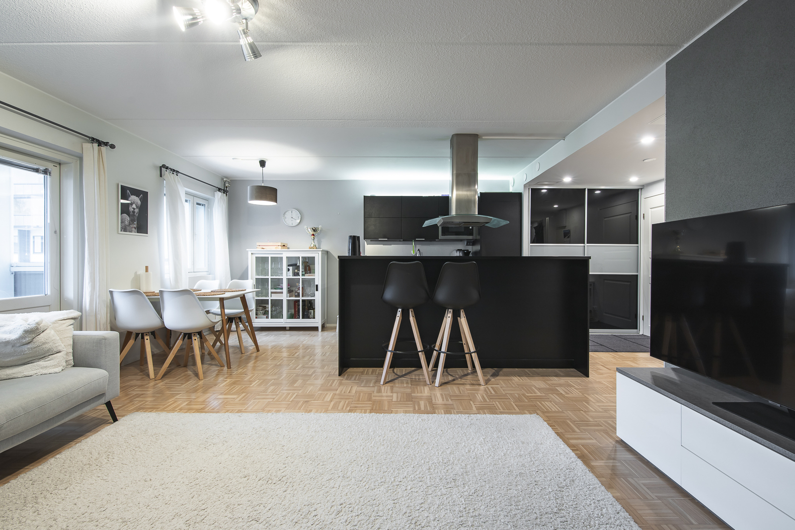 Huoneistoon tultaessa sinua tervehtii avara ja valoisa koti, eteinen, keittiö ja olohuone ovat yhtä suurta tilaa. Makuuhuone on mukavankoinen ja siinä on hyvin kaappitilaa. Kylpyhuone on tilava ja siinä on paikka pyykinpesukoneelle, saunassa nautit sen antamista lempeistä löylyistä.