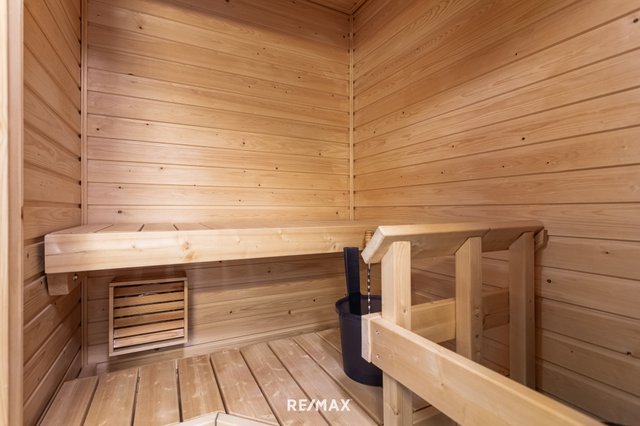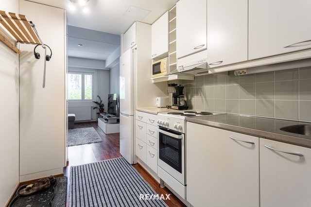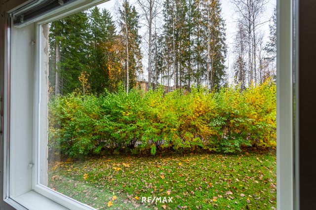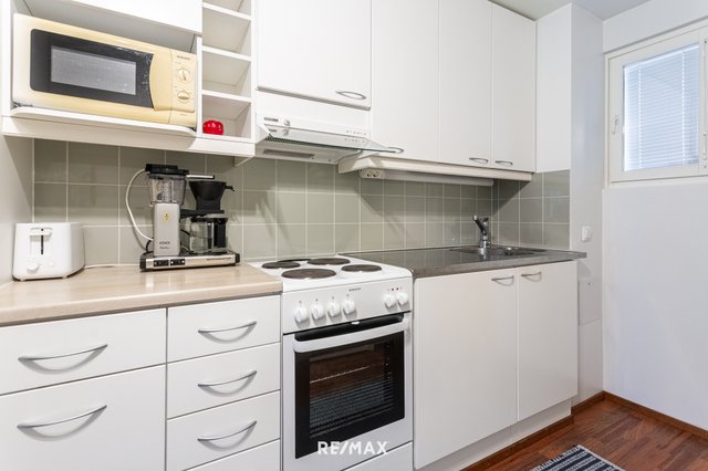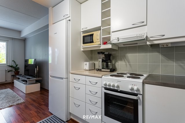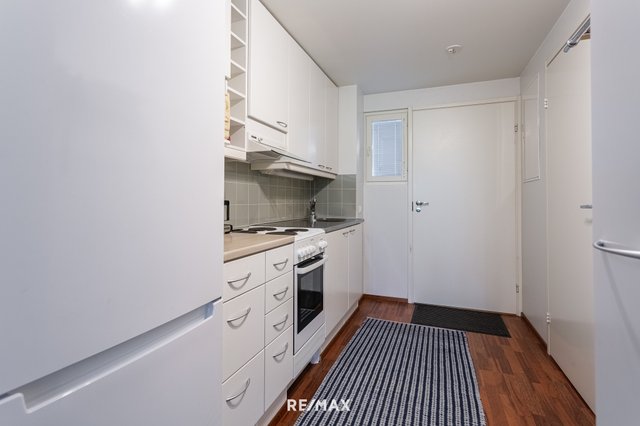 Keittiötila ja laatoitettu kylpyhuone täydentävät kokonaisuuden. Oman saunan sähkökiuas tarjoaa rentouttavia hetkiä arjen keskellä.