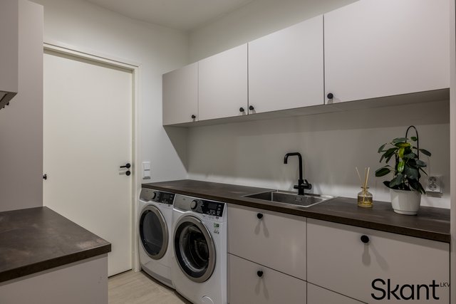 - Pesukoneliitäntä, lattiakaivo, pyykkikaapit, pöytätaso, ja siivouskaappi ja paikka kuivausrummulle.