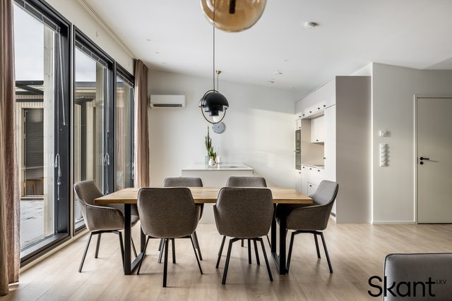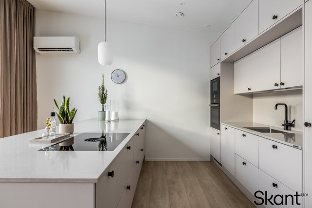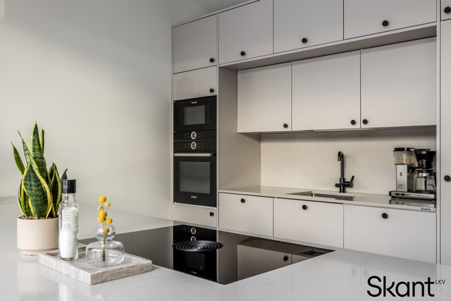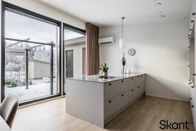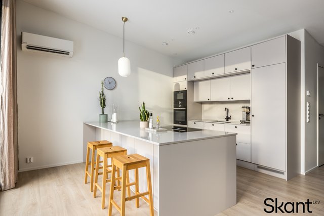 Keittiössä on runsaasti kaappitilaa, integroidut kodinkoneet sekä kattavasti kivipintaisia työskentelytasoja. Tilaa riittää mainosti koko perheen yhteisiin ruoanlaittohetkiin.