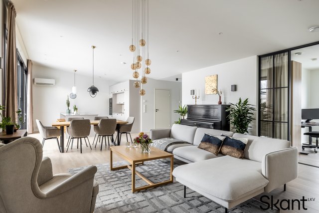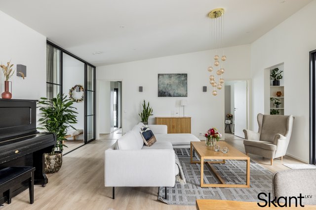Laatoitetusta eteisestä avautuu tunnelmallinen ja tilava olohuone–keittiötila. Korkea huonekorkeus ja suuret ikkunat tuovat runsaasti luonnonvaloa, ja niiden kautta katse kantaa kauniisti puistomaisen maiseman yli luonnon helmaan. Olohuoneesta on käynti etelään avautuvalle suojaisalle terassille, jonne mahtuu hyvin ruokailuryhmä sekä sohvakalusteet.