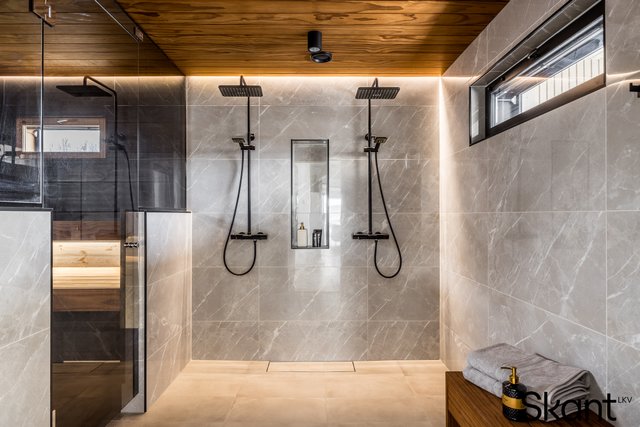 - Suihku (x2 sadesuihku), lattialämmitys, ja puupenkki ja linjalattiakaivo