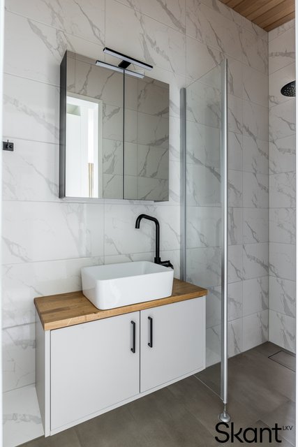 - Pesutilan katossa radiata mänty paneelit ja suihkuseinälle upotettu tunnelma led-valaistus. Päämakuuhuoneen yhteydessä olevassa kylpyhuoneessa seinä wc, allaskaappi, peilikaappi, suihkuseinä, linjalattiakaivo ja sadesuihku.
