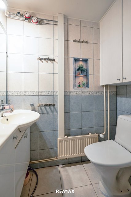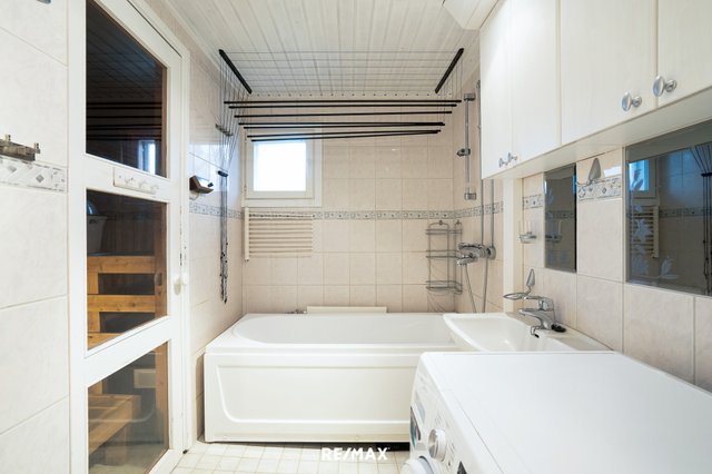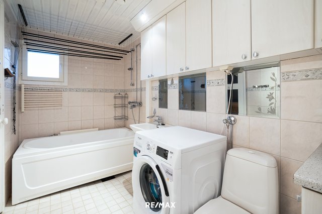 - WC-istuin, suihku, kylpyamme, pesukoneliitäntä, lattialämmitys, peili, ja pesuallas