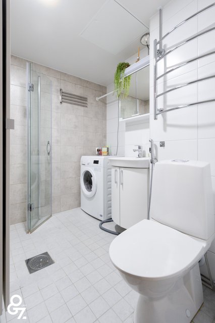 - WC-istuin, suihku, suihkuseinä, pesukoneliitäntä, peilikaappi, pesuallas, allaskaappi, ja bidee-suihku