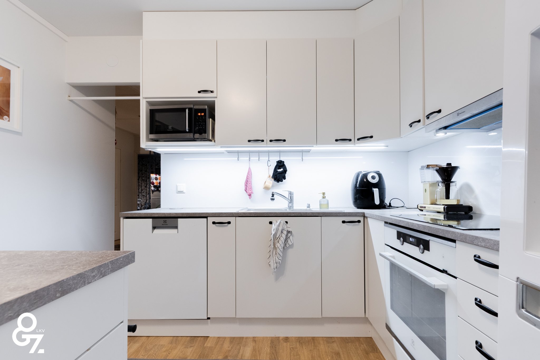 - Jääkaappipakastin, erillisuuni, liesi, liesituuletin, astianpesukone, ja keittiösaareke, jossa sähköt