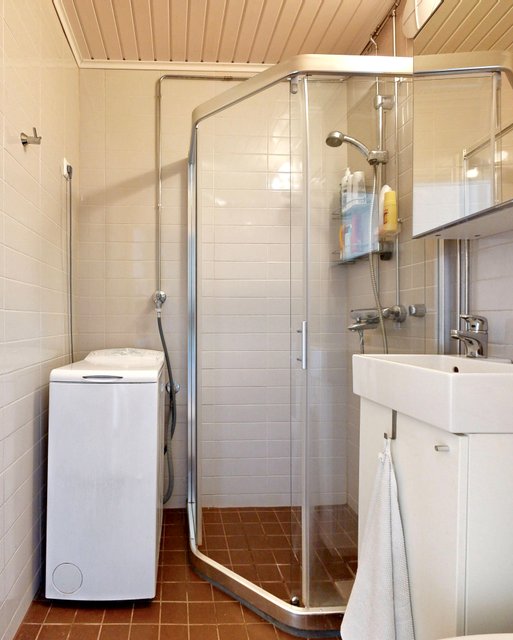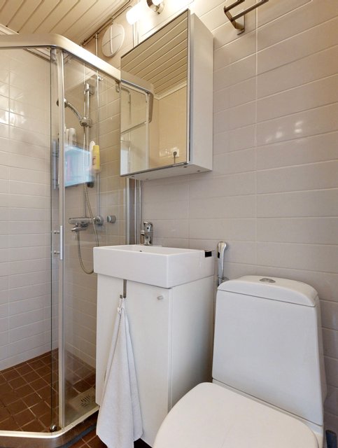 - VARUSTUS: Suihku, Suihkuseinä, WC-istuin, Pesukoneliitäntä, Allaskaappi, Hana, Peilikaappi, SEINÄ: Laatta. LATTIA: Kaakeli.