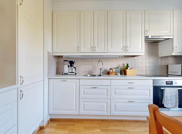 - VARUSTUS: Keraaminenliesi, erillisuuni, Liesituuletin, Hana, Kaapisto, Allas, Astianpesukone, Jääkaappipakastin. TYÖTASO: Laminaatti. LATTIA: Parketti. SEINÄT: Välitila laatta. Maalattu.