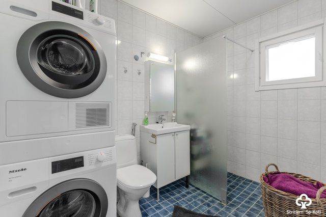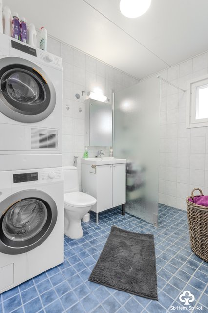 - WC-istuin, suihkuseinä, peilikaappi, ja pesukoneliitäntä