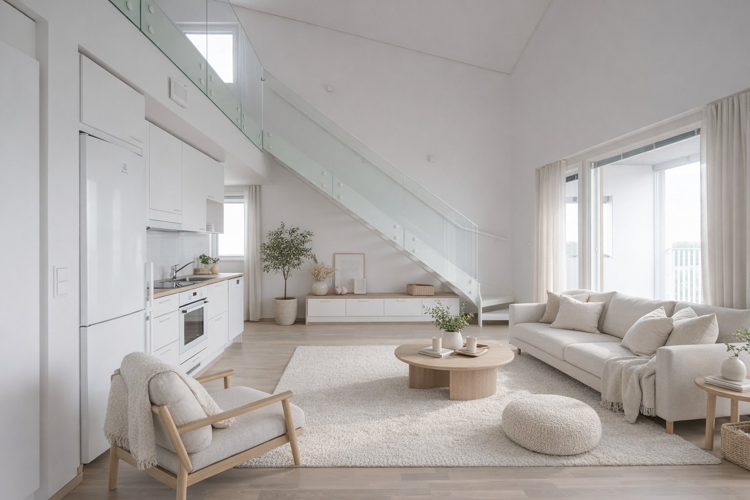 Koti sijoittuu hissitalon 7.–8. kerrokseen, ja koko huoneiston levyinen lasitettu parveke toimii erinomaisena lisähuoneena ympäri vuoden. Moderni keittiö on varustettu nykyaikaisilla kodinkoneilla, ja harkitut materiaalivalinnat viimeistelevät tyylikkään kokonaisuuden.