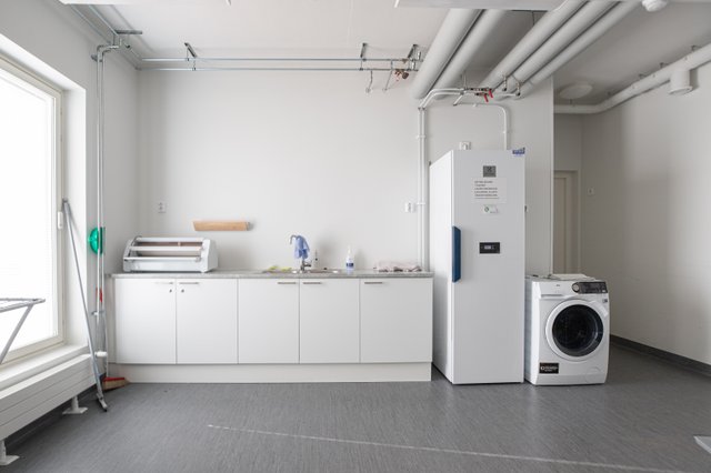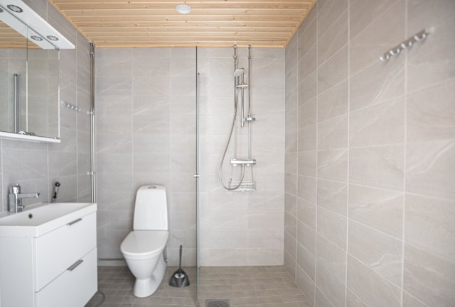 - Suihku, suihkuseinä, wc-istuin, lattialämmitys ( sähkönkulutus sisältyy hoitovastikkeeseen), peilikaappi, allaskaappi, ja pesukoneliitäntä