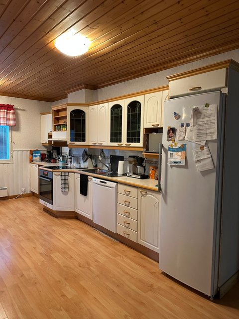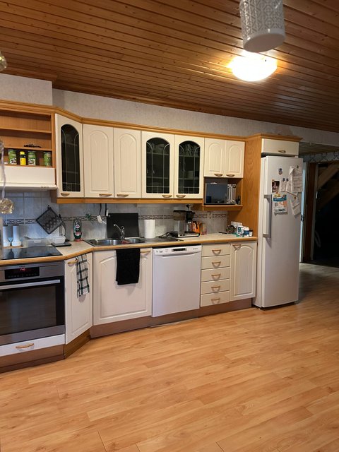- Valkoiset kaapistot, jääkaappi (2020), erillisuuni ja liesitaso, liesituuletin ja astianpesukone (2019).