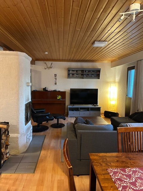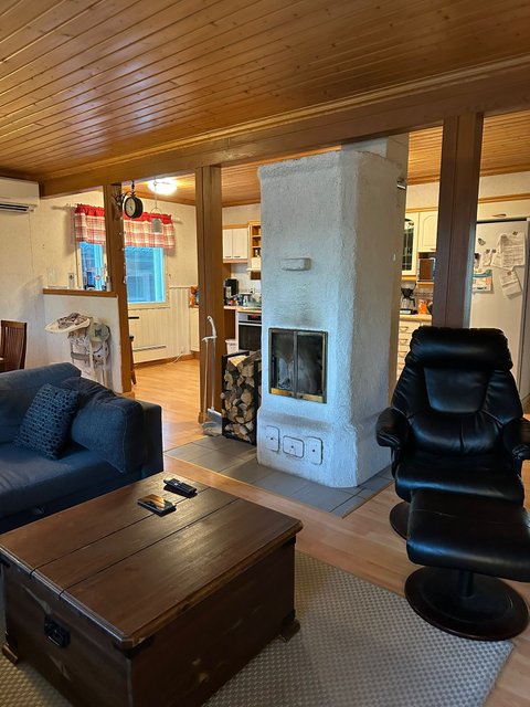 - Tilava olohuone, jossa varaava takka.