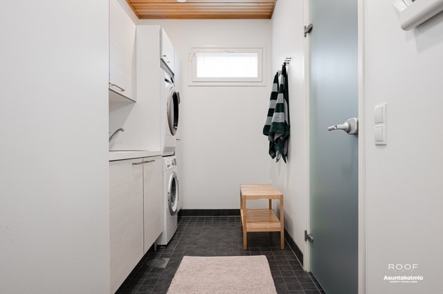 - Pesukoneliitäntä, tila pesutornille, pesuallas, ja lattiakaivo