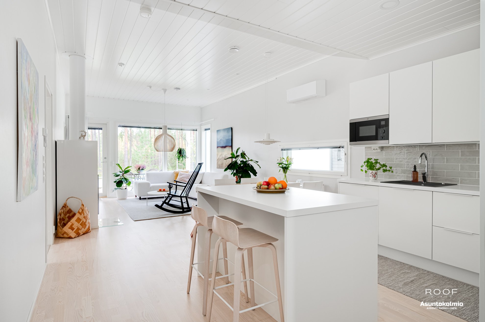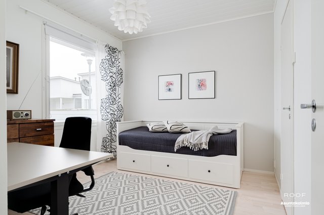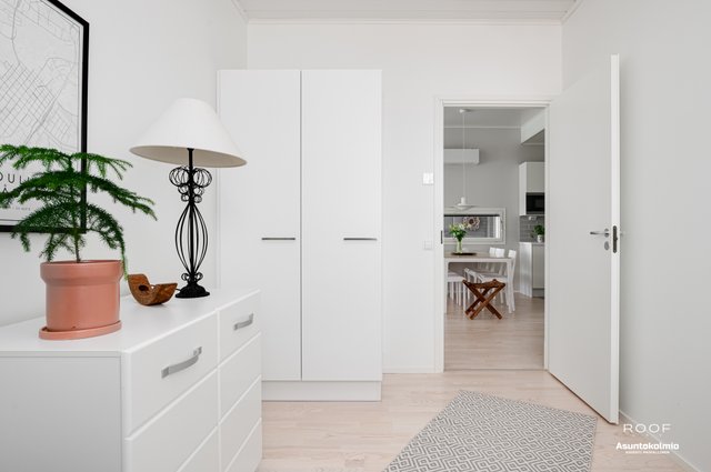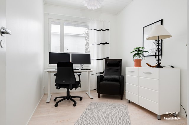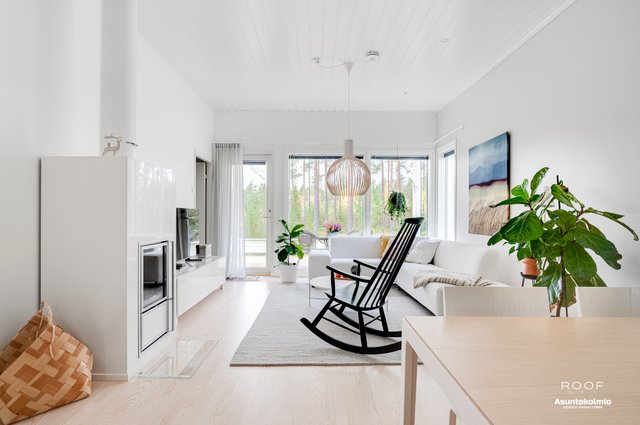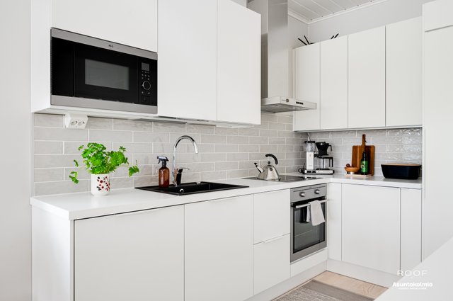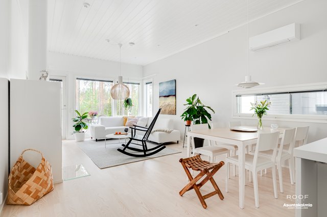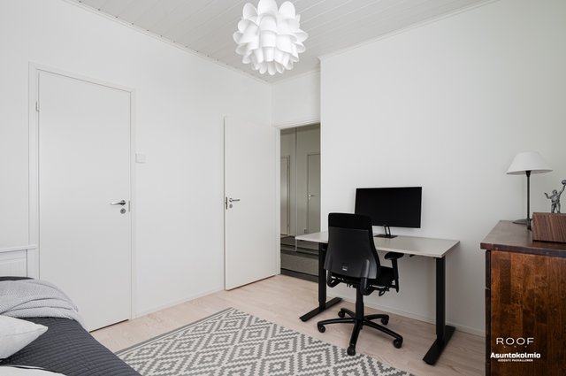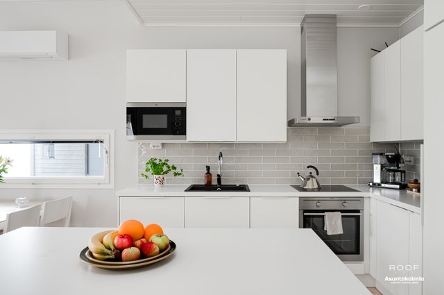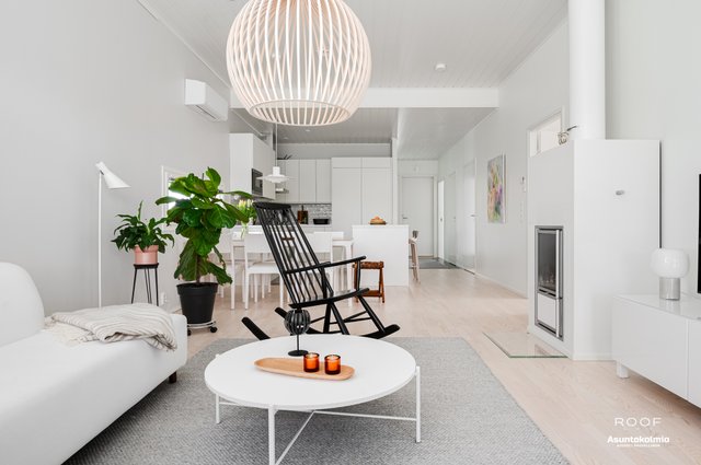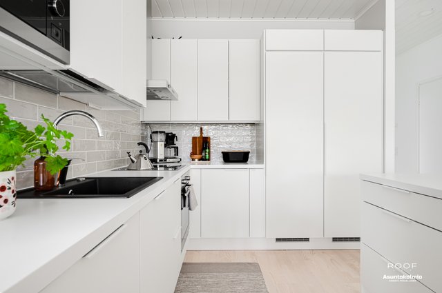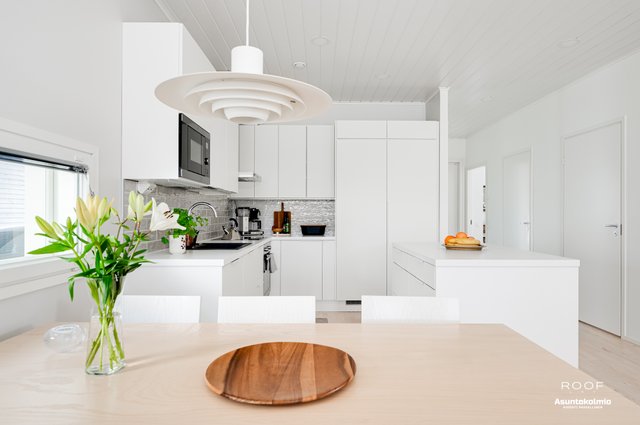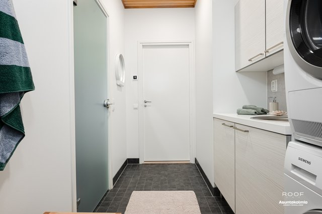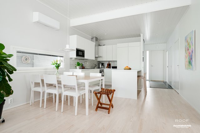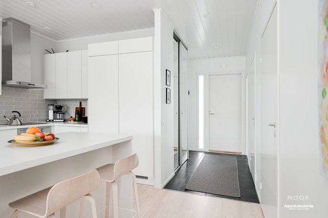 Puroilan toteuttamille kodeille ominaisesti asunnossa on erittäin toimiva pohjaratkaisu, kaksi autopaikkaa suoraan asunnon edessä joista toinen katoksessa sekä poikkeuksellisen hyvässä kunnossa olevat ajattoman kauniit materiaali- sekä kalustevalinnat. Kaikki kodin kiintokalusteet ovat laadukasta Puustellia ja ylipäätään kotiin on tehty rakennusvaiheessa reilusti tasoa parantavia muutostöitä ja esimerkiksi kuivien tilojen lattiat ovat joko laattaa tai vaaleaa saarniparkettia. Laadukkaasta keittiöstä saarekkeineen löytyy reilusti niin lasku- kuin kaappitilaakin, ruokapöydälle oma selkeä paikkansa ja olohuonekin on helppo kalustaa. Kiinteiden kalusteiden, erillisen kodinhoitohuoneen, käytännöllisen arkieteisen ja vaatehuoneen ansiosta säilytystilaakin löytyy reilusti.