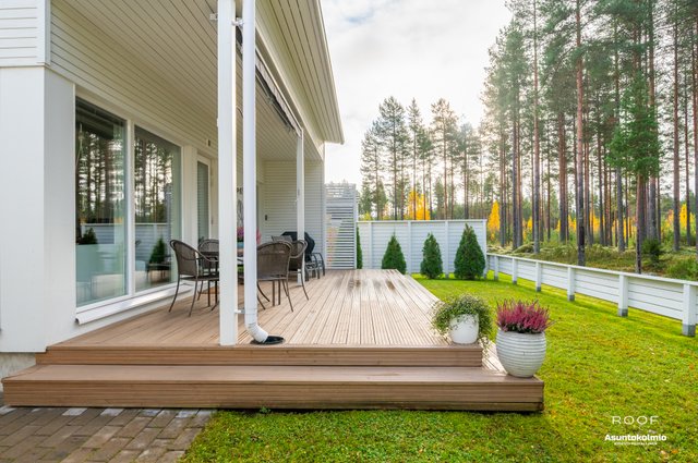 Tällaisella takapihan sijainnilla varustettuja vastaavia erillistalokoteja ei koko Hiukkavaarassa montaa ole. Puuaidoin rajattu parhaan ilmansuunnan suuntainen takapiha on niin suojainen, ettei sinne näe käytännössä mistään.