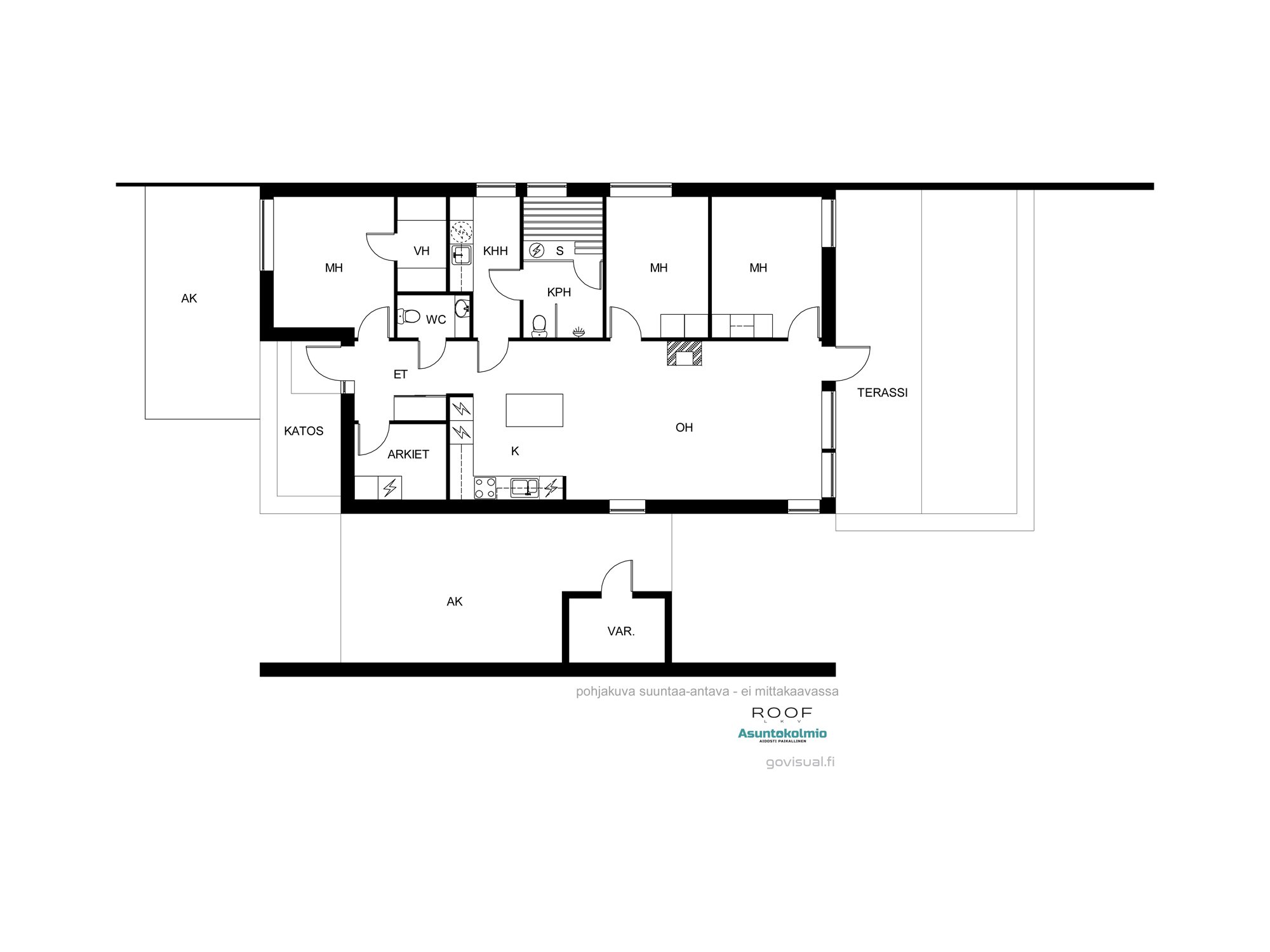 - Eteisessä laattalattia ja liukuovikaapistot. Arkieteisessä laattalattia ja lattiakaivo (kiinteät säilytysjärjestelmät kuuluvat kauppaan).