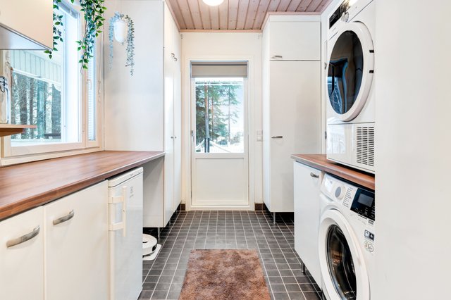 - Lattialämmitys, pesukoneliitäntä, pyykkikaapit, pöytätaso, ja keskuspölynimuri