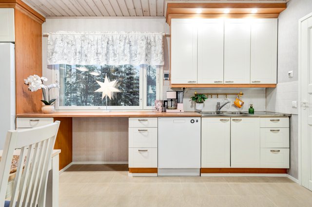 - Viihtyisä keittiö, jossa mukavasti laskutilaa ja kaapistoja.