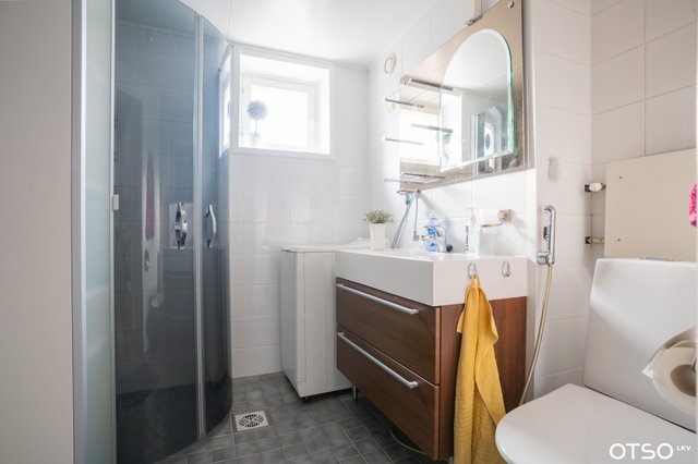 - WC-istuin, suihku, suihkuseinä, pesukoneliitäntä, peili, pesuallas, allaskaappi, ja bidee-suihku