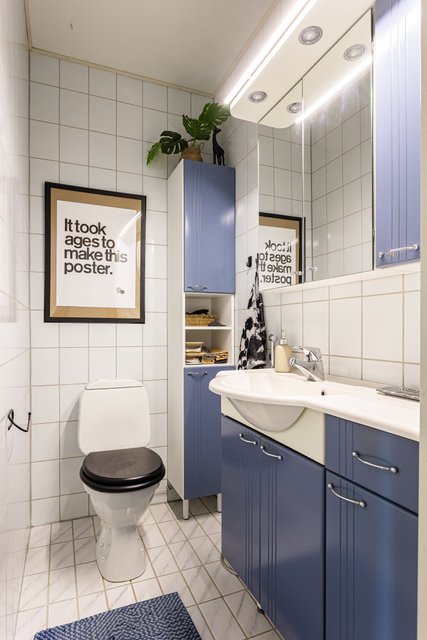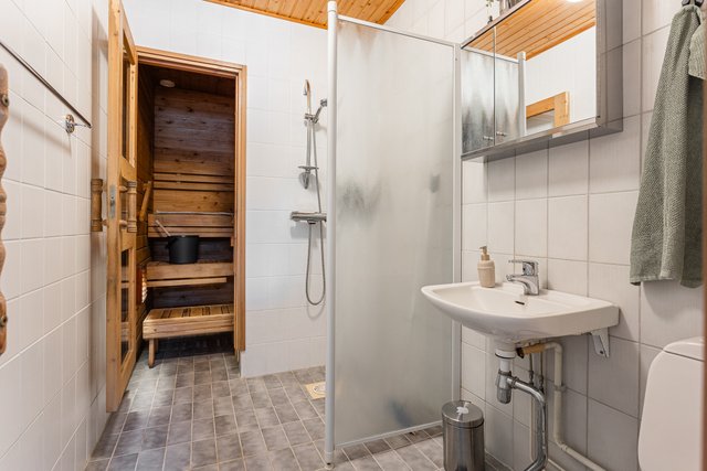 - WC-istuin, peilikaappi, suihku, ja lattialämmitys