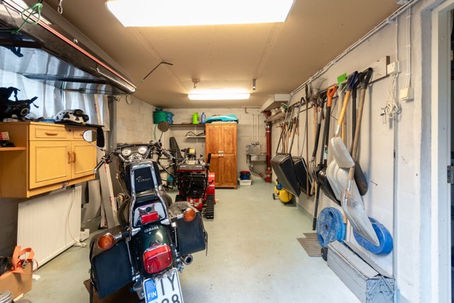 - Varastohuone autotallin yhteydessä, lämmin varastotila sähkökaapin yhteydessä, kaapistot.
