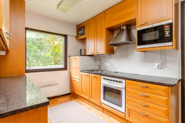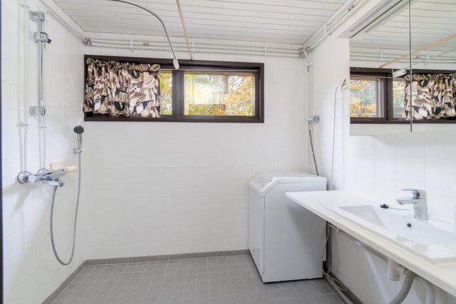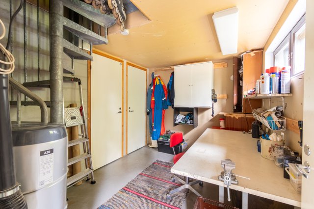 - Vitriini keittiön vieressä, laskosverho, varaston metallihyllyt (autotallin viereinen varasto), kellarihuoneen hyllyt.