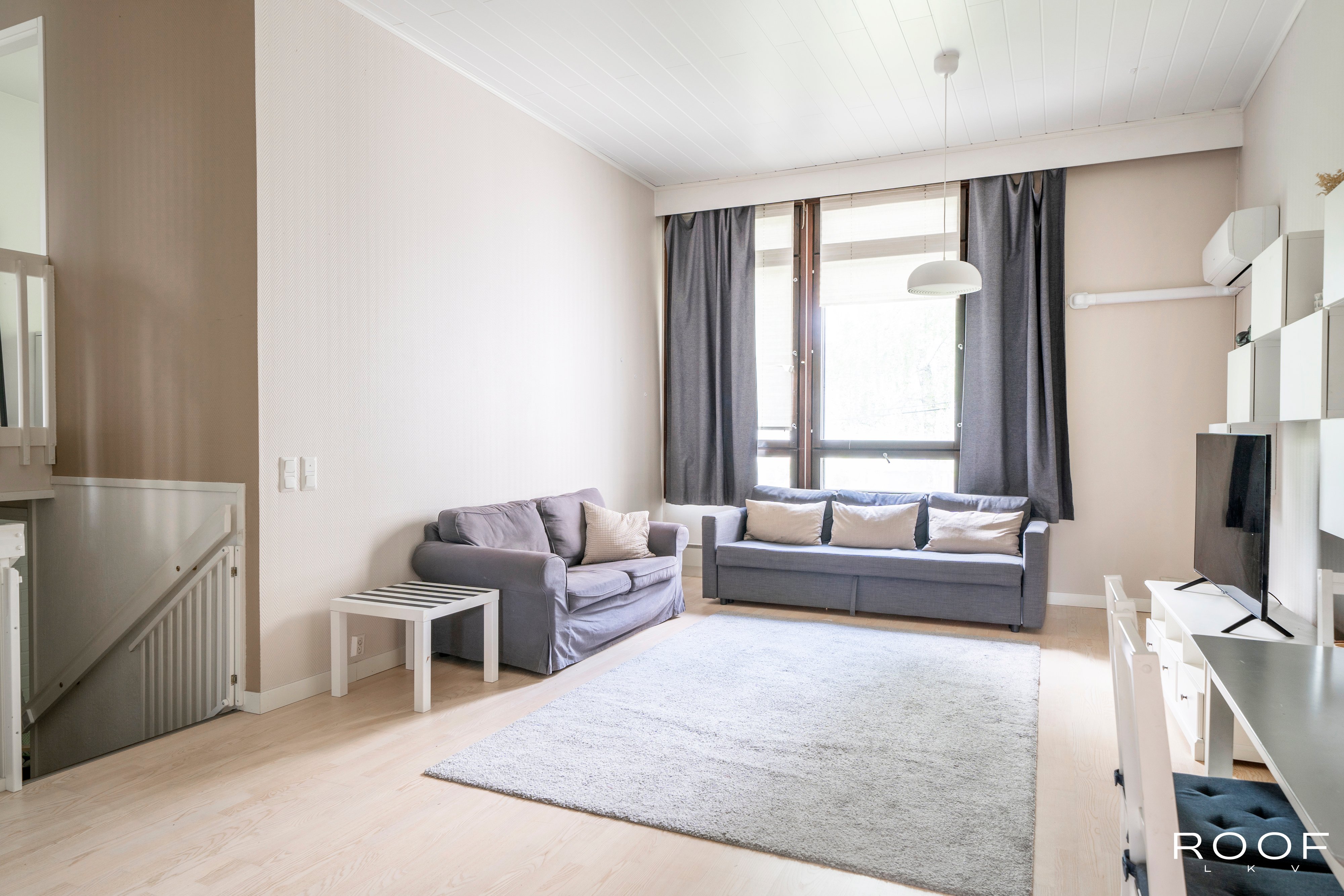Nyt on todella edullista asumista kauniissa asunnossa, hoitavastike vain 2,85€/ m². Tämä koti jakautuu kivasti kolmeen tasoon. Sisääntulo kerroksessa sijaitsevat tyylikäs avokeittiö sekä iso valoisa olohuone, joka hurmaa noin kolmen metrin huonekorkeudellaan. Muutama porras ylös, sijaitsevat kodin kaksi makuuhuonetta sekä kaunis kylpyhuone. Ja muutama porras