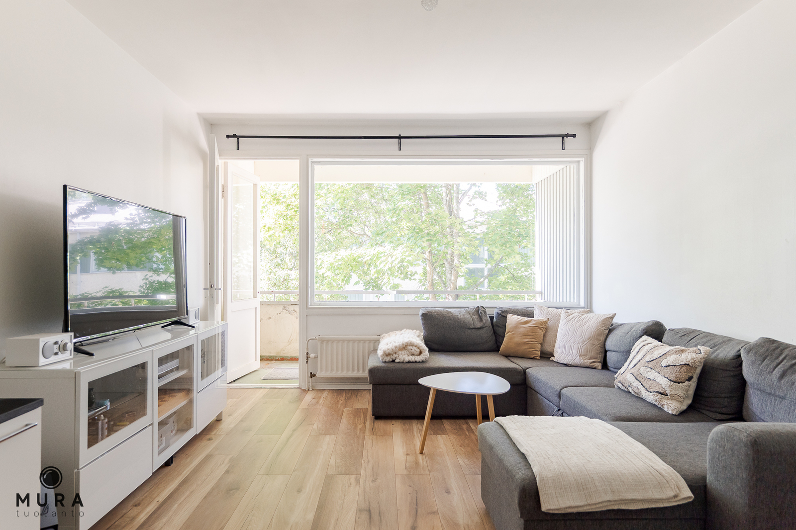 Asunnossa on remontoitu viime vuosien aikana kattavasti. Avara ja valoisa olohuone. Moderni, tummasävyinen keittiö, joka tekee keittiöstä tyylikkään. Makuuhuone on rauhallinen ja tilava, kylpyhuone toimiva, ja parvekkeelta avautuu viihtyisä puistomainen näkymä.