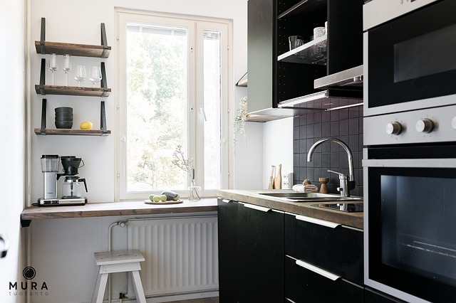 - Tyylikäs tumma keittiö, jossa integroitu mikroaaltouuni, integoitu uuni, induktioliesi, integroitu jääkaappi/ pakastin, astianpesukone.