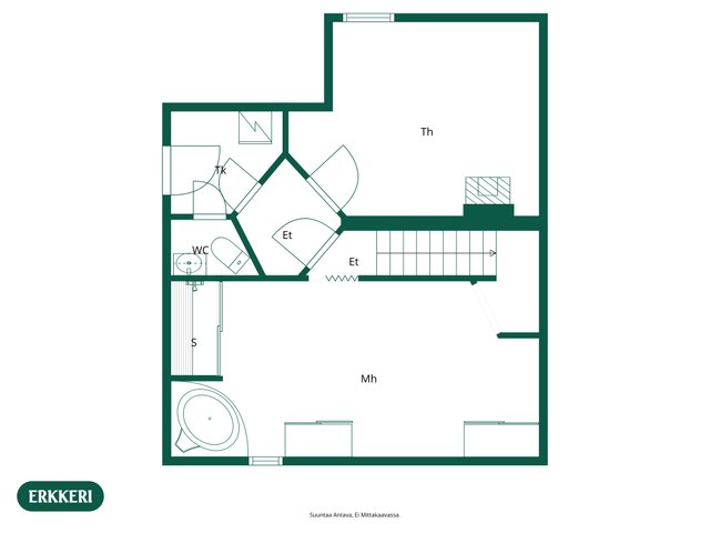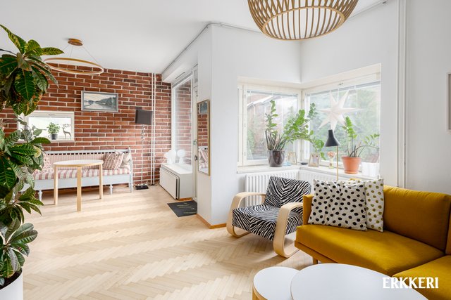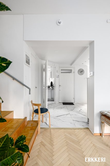 Eteisen ja keittiön marmorikuvioinen laatta luo ylellisen ensivaikutelman, ja olohuoneen kalanruotoparketti, tiiliseinä ja takka viimeistelevät tyylikkään ja lämpimän kokonaisuuden, tuoden samalla ajattoman klassisen ilmeen. Kerrokseen sijoittuu myös erillinen wc, joka on uusittu laadukkailla materiaaleilla.
