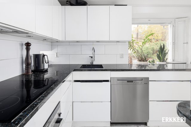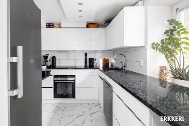 - Uudet kivi-lattialaatat 2021, keittiössä ja eteisessä; lattialämmitys 2021, Miele-jääkaappi 2021, Miele-astianpesukone 2021, Bosch-mikrouuni 2021, keittiön graniittitaso 2025