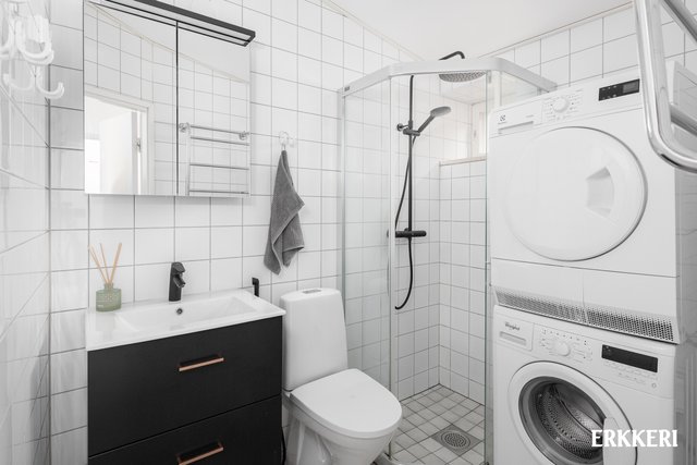 - WC-istuin, suihku, suihkuseinä, pesukoneliitäntä, peilikaappi, pesuallas, allaskaappi, ja bidee-suihku