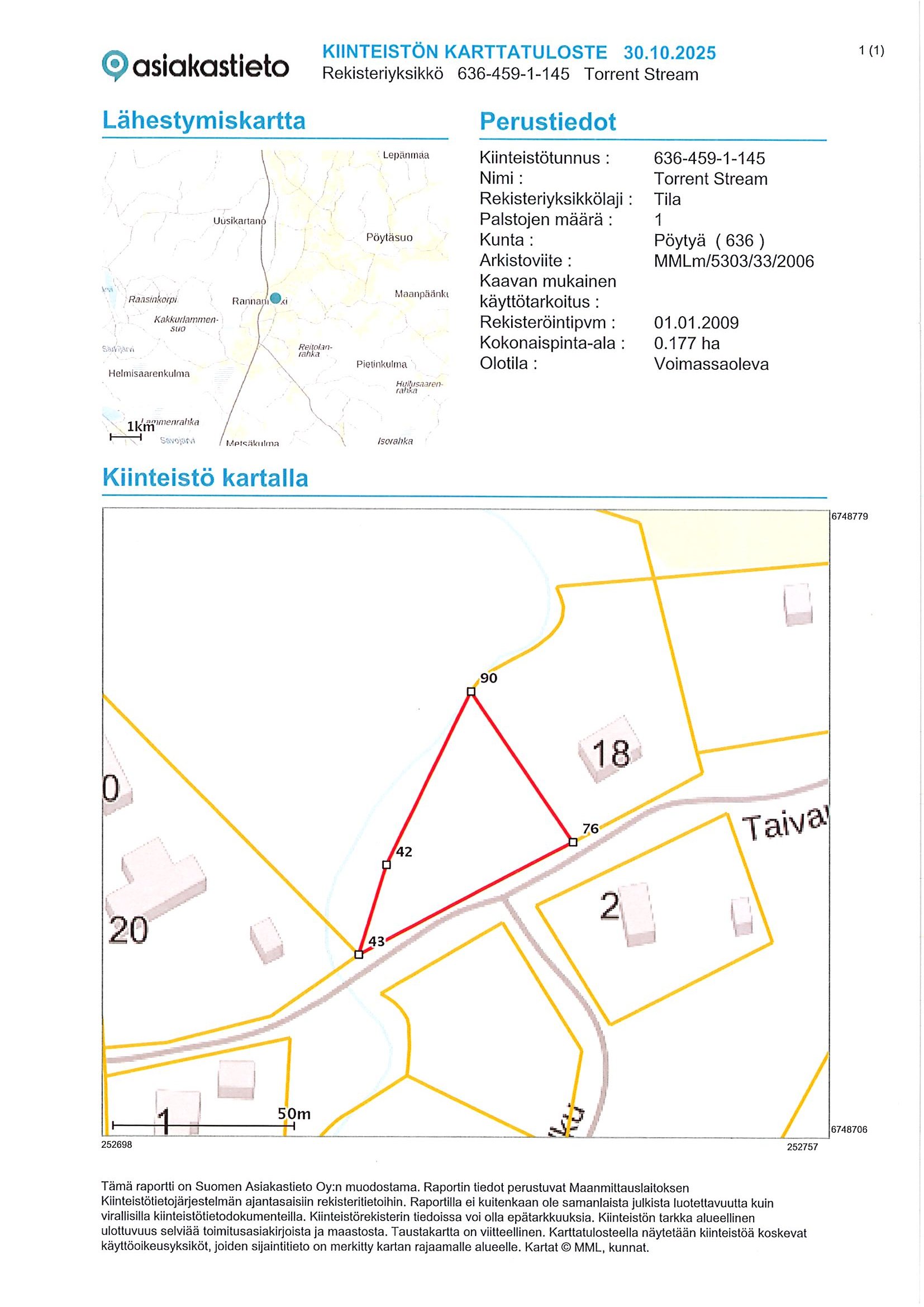 Tontti on pienen joenuoman rannassa rinteessä ja joenoma rajaa tonttia rannassa. Lupahakemuksissa päärakennus piirretty ylärinteeseen kalliopohjalle. Tonttia rajaa Taivarojantie sen koko pituudelta. Tontilla on tuuhea kasvillisuus ja se rajautuu sillan puoleiselta sivultaan kunnan luonnontilaiseen joenrantaan.