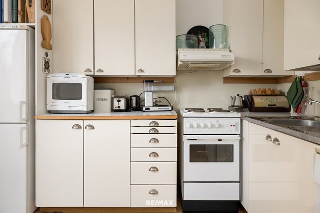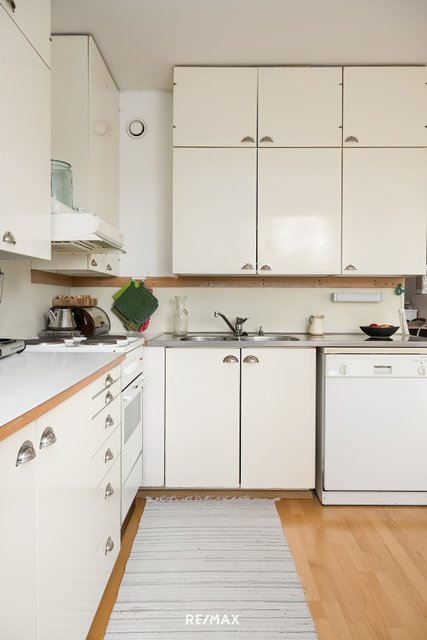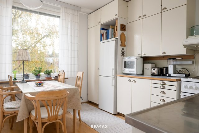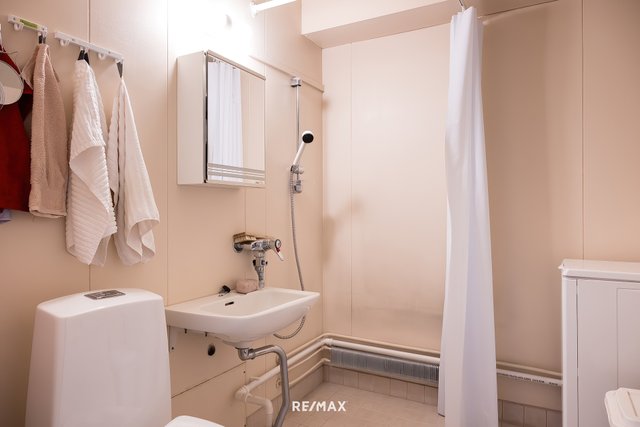 Keittiö on käytännöllinen ja siistissä peruskunnossa ja tarjoaa hyvän pohjan päivittämiselle oman maun mukaiseksi. Kylpyhuone on tilava ja toimiva, ja tarjoaa mahdollisuuden toteuttaa oma sisustustyyli.