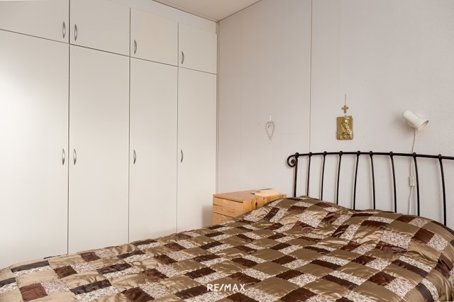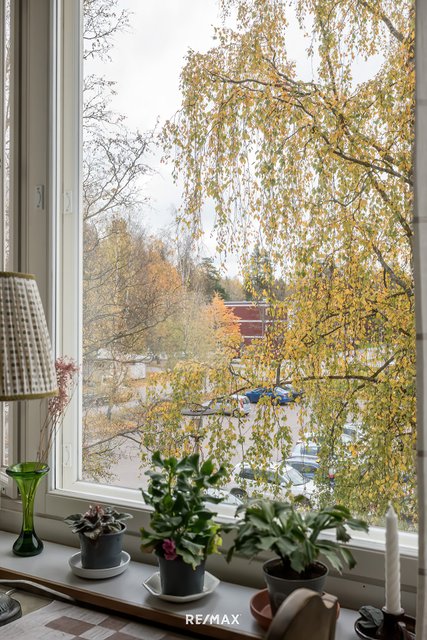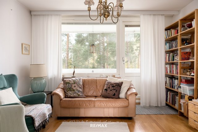 Avara olohuone kutsuu rentoutumaan, ja sen jatkeena oleva lasitettu parveke länteen tarjoaa viihtyisän paikan nauttia ilta-auringosta ja puistomaisista näkymistä. Makuuhuone on tilava ja toimiva, ja säilytystilaa löytyy runsaasti – vaatehuoneen lisäksi tilaa tarjoavat myös eteisen kaapistot.