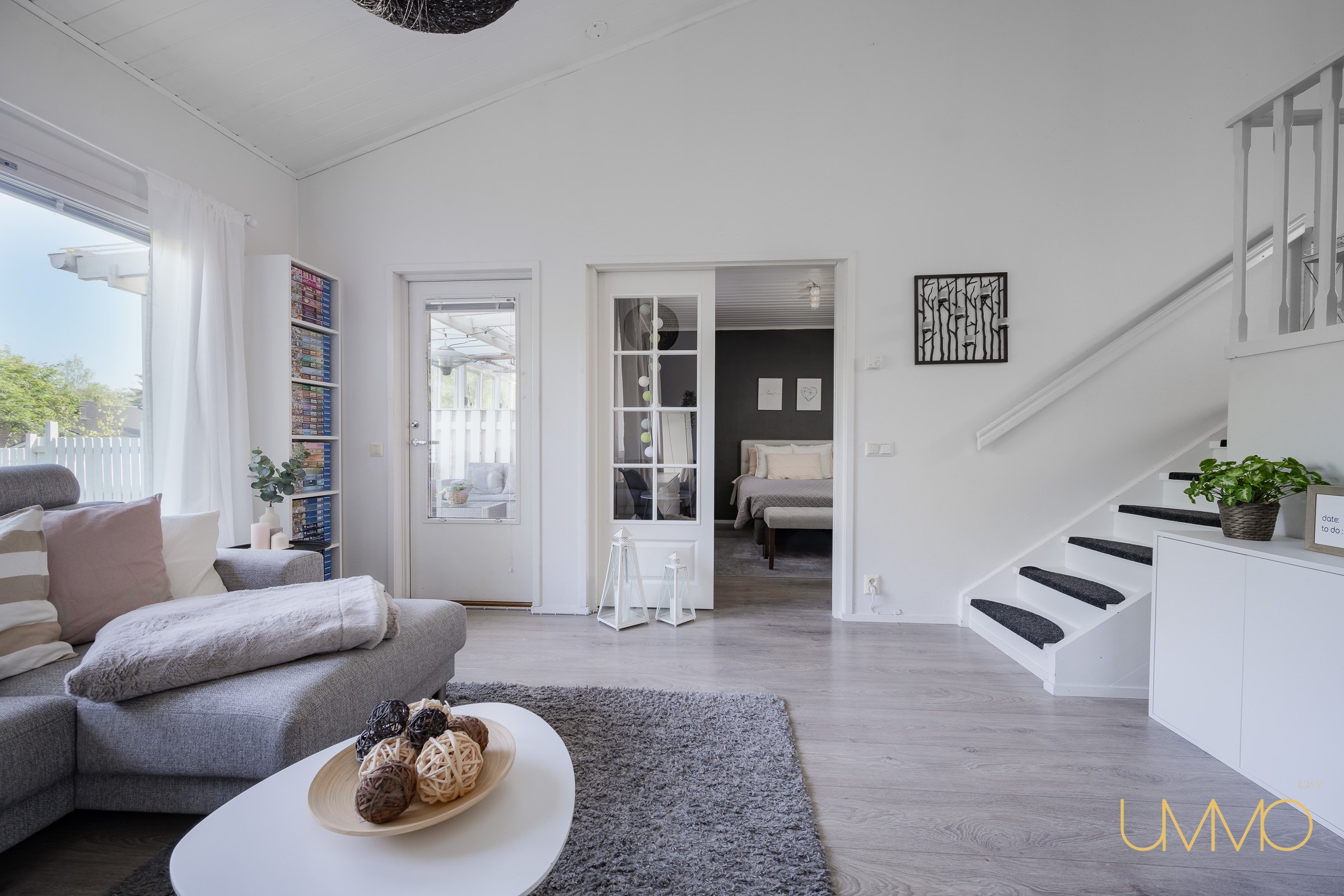 Koti itsessään on kaunis, valoisa ja persoonallinen. Tämä on huolella pidetty ja hyvällä maulla remontoitu. Olohuoneessa on korkea kattokorkeus sekä viistokatto, joka tuo tähän tilaan avaruutta. Olohuoneessa ilmalämpöpumppu tuomassa säästöä lämmityskustannuksiin sekä viilentää kesän helteillä. Olohuoneen vierestä löytyy mukavan kokoinen makuuhuone. Makuuhuoneessa ihastuttavat lasipariovet tuomassa tunnelmaa.