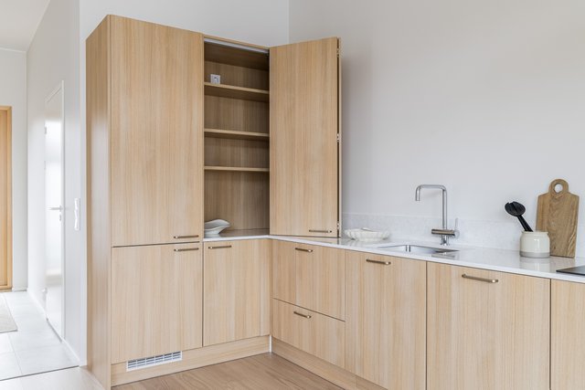 - Puustellin keittiö aamiaiskaapilla, kvartsitasoilla, valokiskolla sekä integroidulla liesituulettimella.