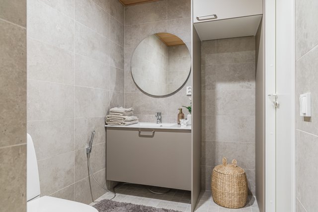 - WC-istuin, suihku, pesukoneliitäntä, lattialämmitys, peili, pesuallas, allaskaappi, ja bidee-suihku
