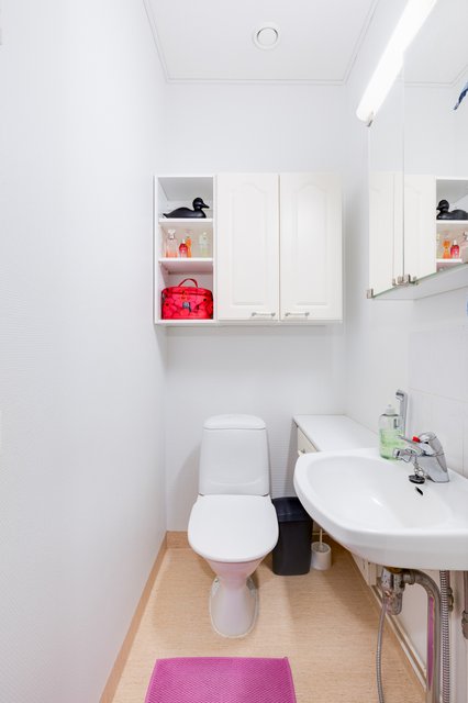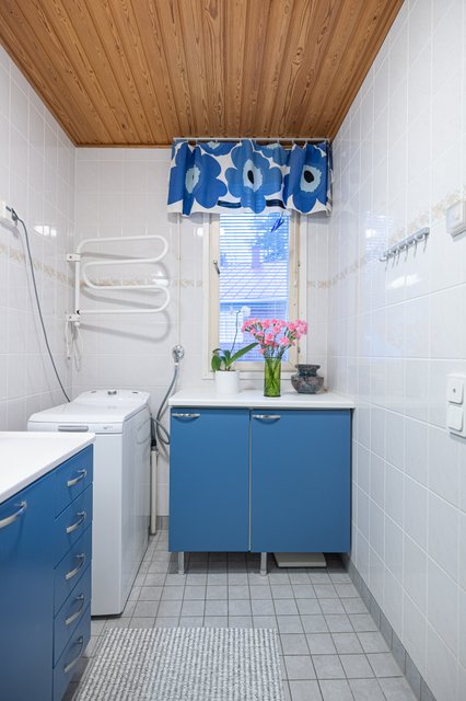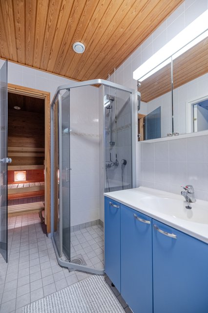 - Suihku, suihkuseinä, pesukoneliitäntä, allaskaappi, ja pesuallas