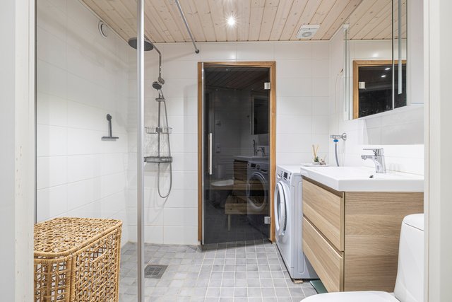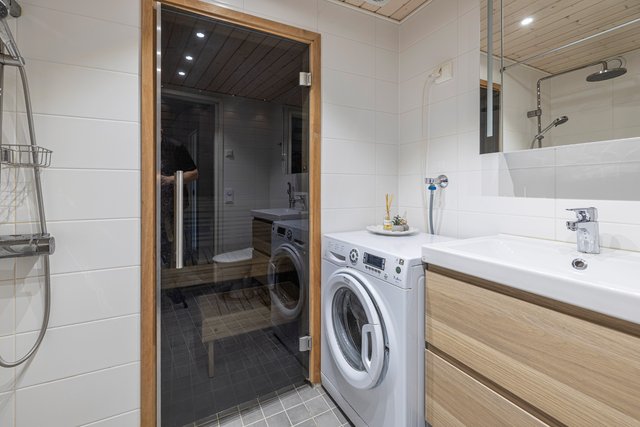 - WC-istuin, suihku, lattialämmitys, pesuallas, allaskaappi, ja pesukoneliitäntä