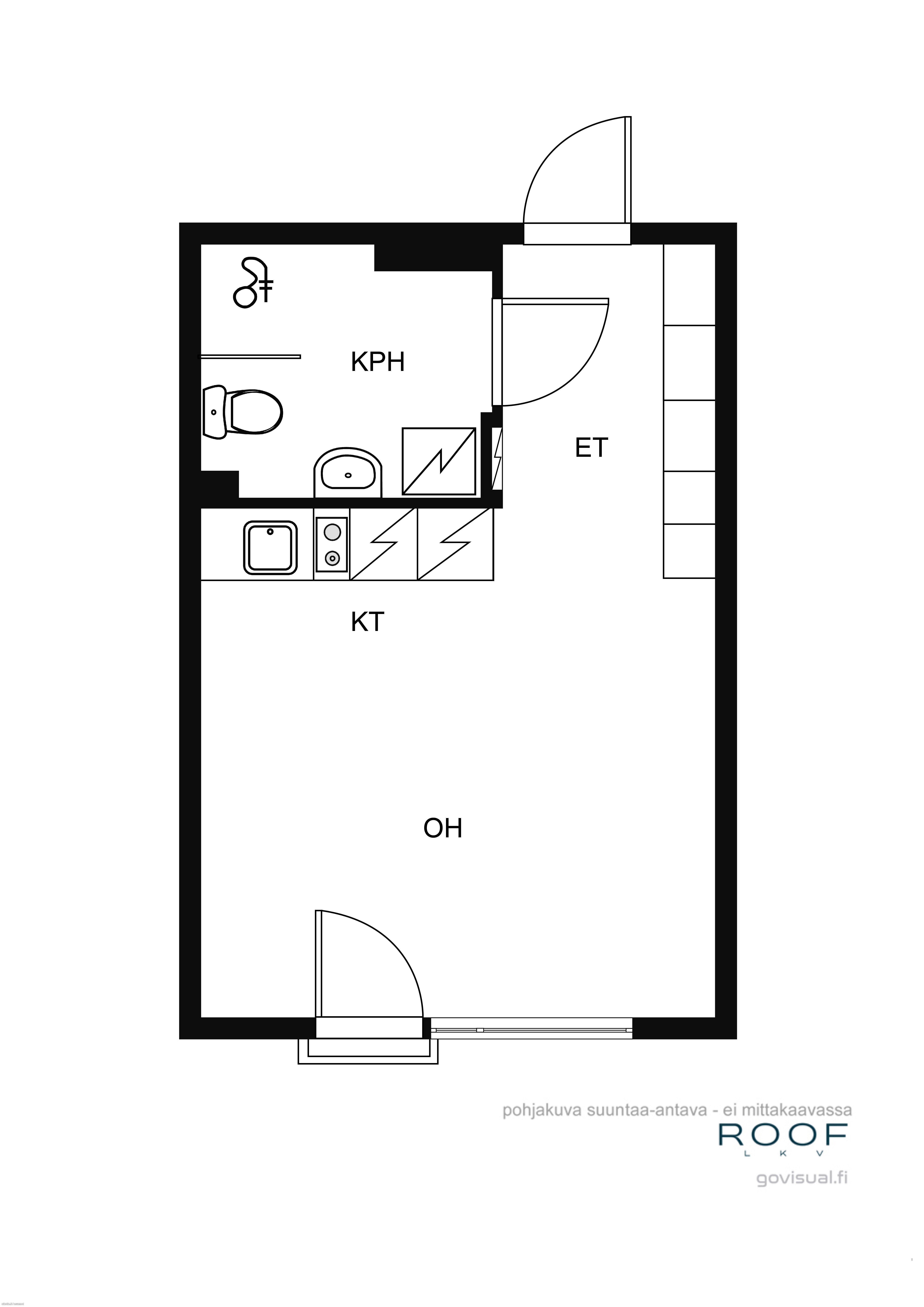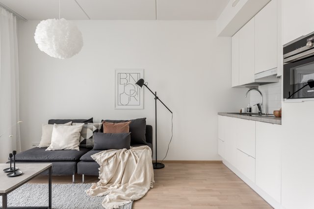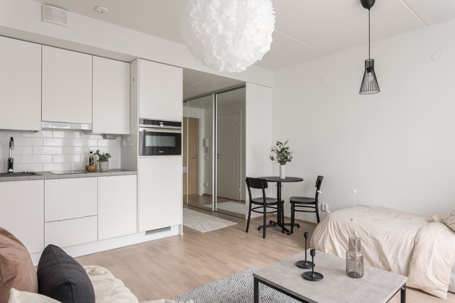 Asunnossa on avara huone, avokeittiö, sekä tyylikäs kylpyhuone lattialämmityksellä. Suuret ikkunat tuovat runsaasti luonnonvaloa, ja ranskalainen parveke lisää viihtyisyyttä kaupunkiasumiseen. Keittiö on varusteltu nykyaikaisesti ja tarjoaa kaiken tarvittavan arkeen.