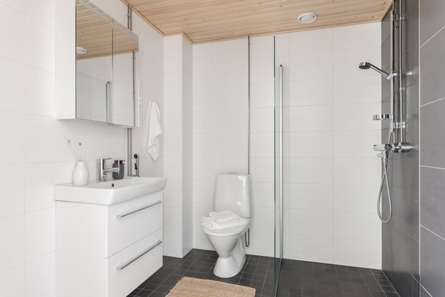 - WC-istuin, suihku, pesukoneliitäntä, peilikaappi, pesuallas, ja lattialämmitys