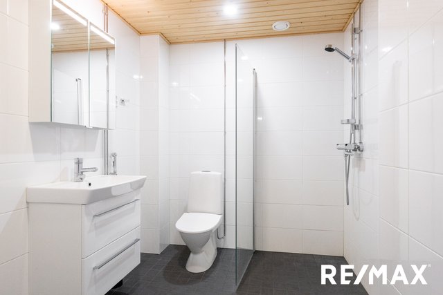 - Peilikaappi, lattialämmitys (mukavuuslattialämmitys asunnon sähköstä), suihku, suihkuseinä, wc-istuin, pesukoneliitäntä, bidee-suihku, ja allaskaappi