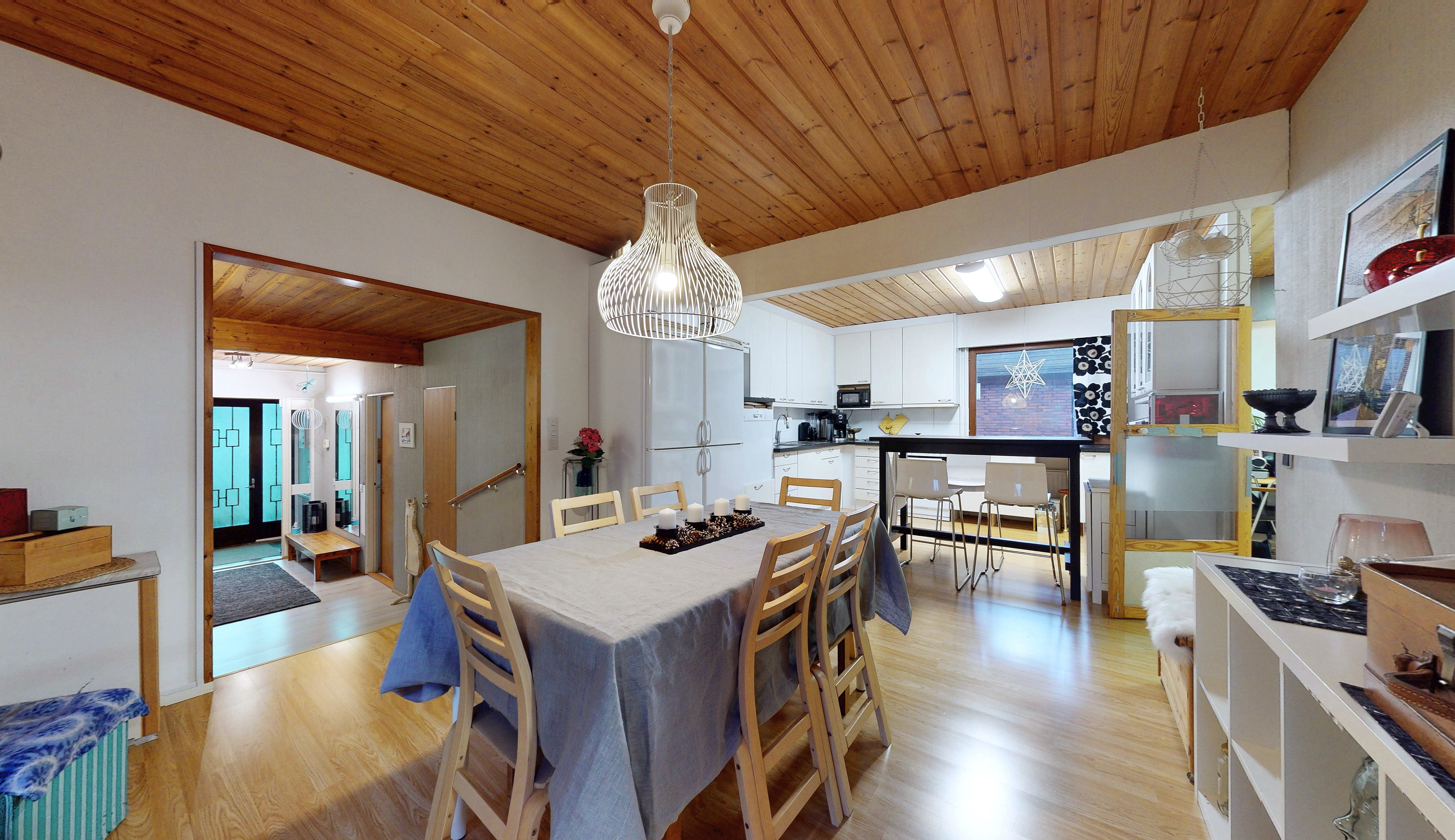 Yläkerrassa on tilava olohuone ja keittiö, joka on remontoitu 2017–2018. Keittiössä on runsaasti tilaa, joten sinne sopii isompikin ruokapöytä. Keittiöstä on erotettu erikseen työhuone on helposti muunneltavissa omien tarpeiden mukaan. Kolme makuuhuonetta tarjoavat tilaa koko perheelle, ja yläkerrassa on kaksi wc:tä, joista toisessa on myös suihkukaappi.