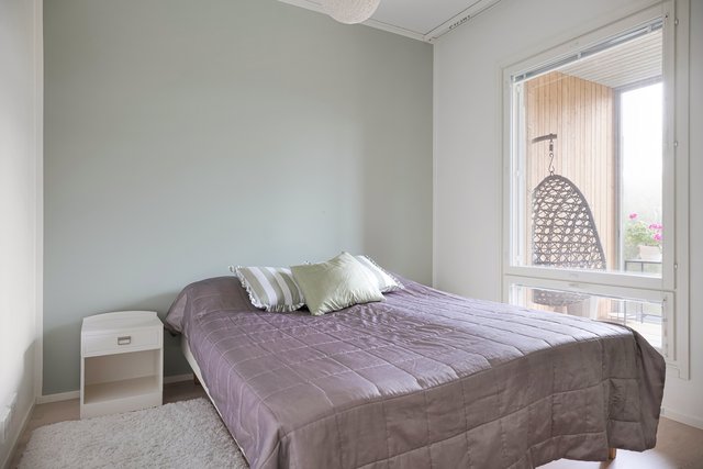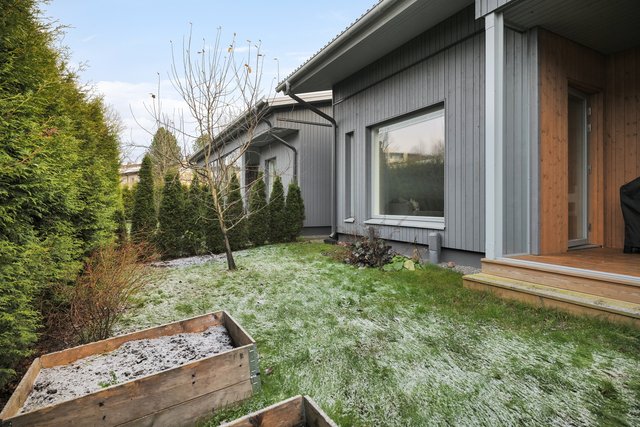 - Olohuoneesta ja päämakuuhuoneesta näkymät puutarhaan sekä lasitetulle terassille, toisesta makuuhuoneesta näkymä taloyhtiön pihalle.