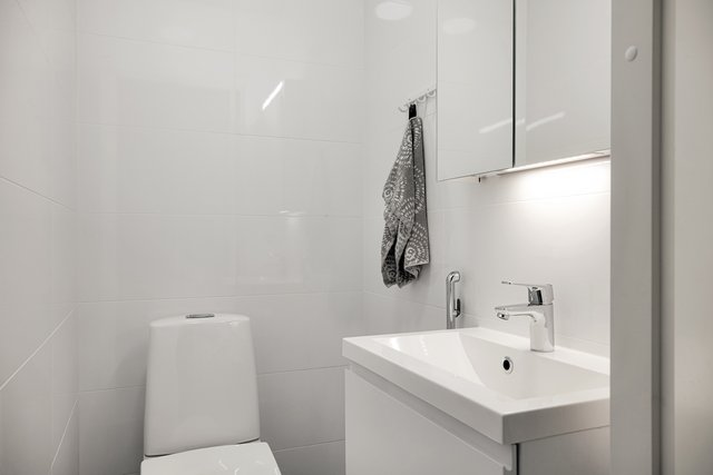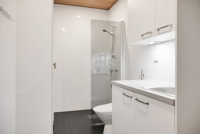 - Suihku, suihkuseinä, pesukoneliitäntä, wc-istuin, allaskaappi, ja peili
