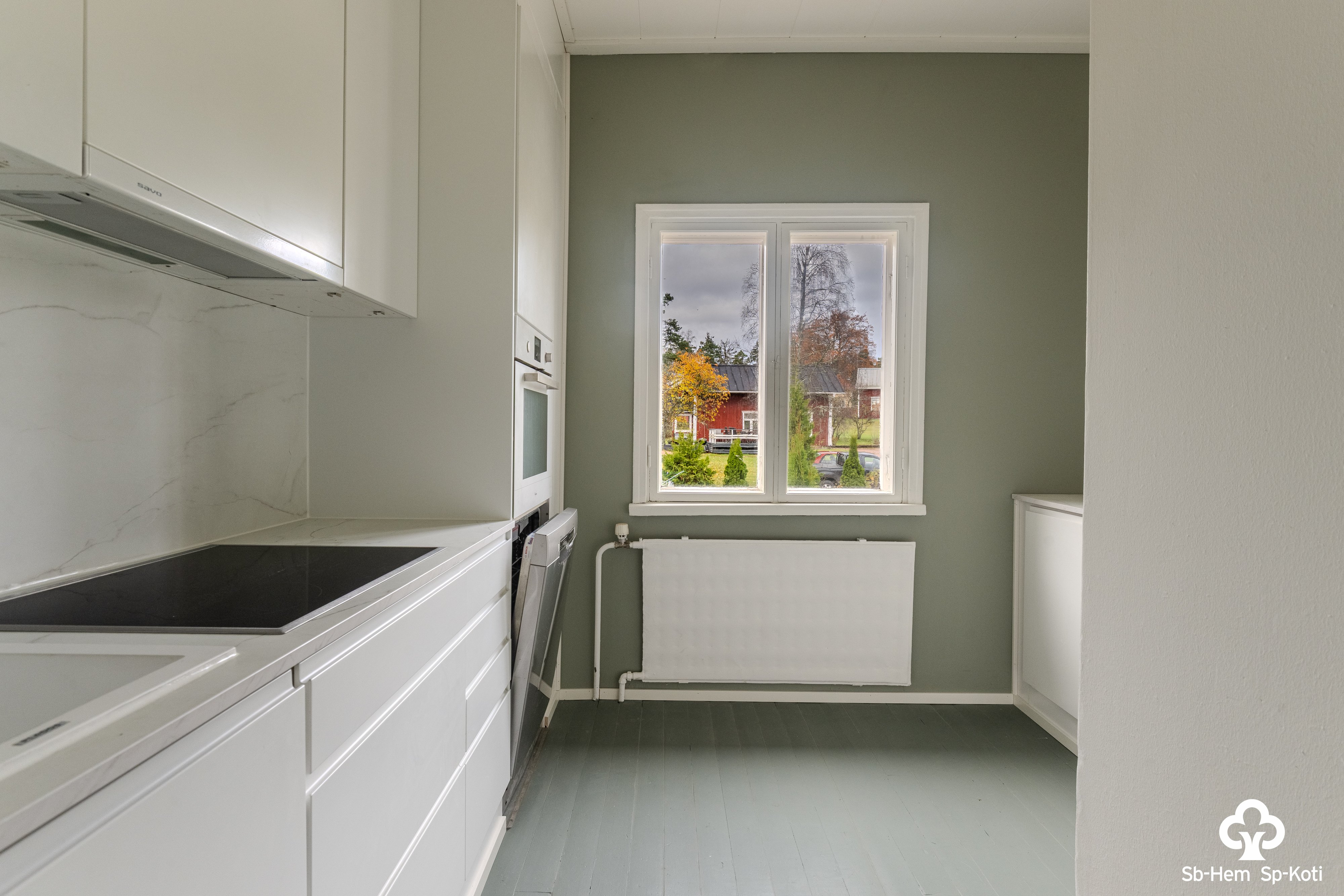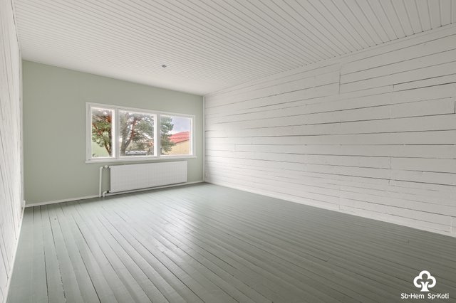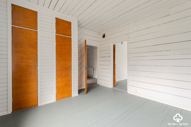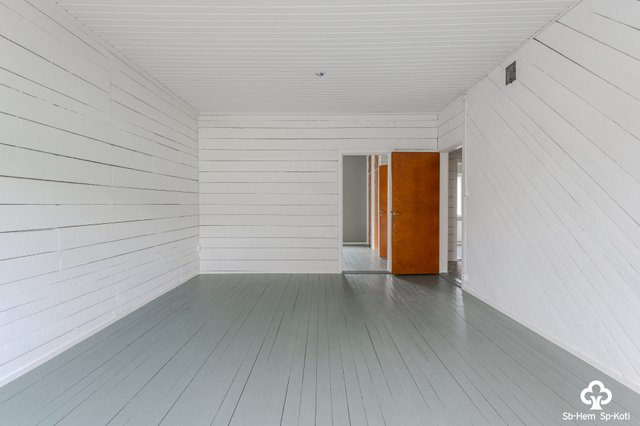 Kauniit harmaaksi maalatut puulattiat, seinät maalattua raakapanelia, 50-luvun henki on säilytetty kauniissa vanhoissa kaapinovissa ja väliovissa. Täysin uusittu moderni keittiö kaikilla mukavuuksilla.